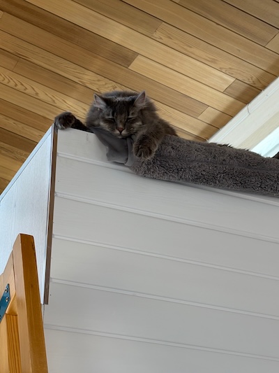 We repainted the exterior and peeled away the yellow tape still clinging to the trim from when the tiny house crossed the ocean. Sometimes we’d stop mid-task to admire the saguaro nearby, its crown in full bloom–a new flower each day. Lori sorted the plastic storage bins for travel while I rearranged the small shed on the south side, securing it with a key-lock box for whoever might need to work on the structure while we were gone. Above us, Neko observed it all from his favorite perch on the loft ladder, the quiet foreman of our leaving.